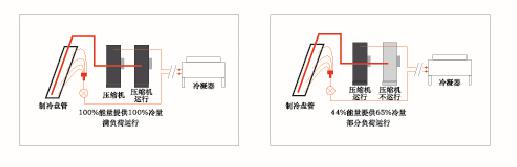 u 部分負荷運行:主壓縮機運行,60%的冷媒作制冷循環,這樣蒸發盤管和冷凝盤管相對而言能力過量,冷媒吸入壓力增加而排出壓力減少,部分負荷性能系數可增大到5.0,既44%的能量即可輸出65%的制冷量;