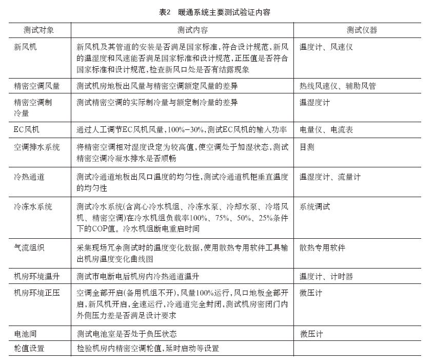 暖通系統的測試驗證工作主要是驗證空調及相關設備的性能和運行參數是否符合設計要求,證暖通系統是否能滿足設計負載對制冷量的要求,驗證系統作為一個整體是否能滿足運行要求并與其他系統匹配運行,驗證系統在故障情況下是否能做出預期的反應并有一定的抗故障能力。有關暖通系統的測試驗證主要工作內容見表2。