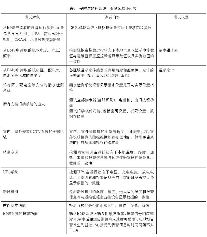 安防與監控系統的測試驗證工作主要是驗證系統相關設備的性能和運行參數是否符合設計要求,驗證系統作為一個整體是否能滿足運行要求并與其他系統匹配運行,驗證監控系統是否能正確的反映被監控設備的工作狀態、運行參數、歷史數據,驗證安防系統是否能起到有效保障數據中心安全的目標。有關安防與監控系統的測試驗證主要具體工作內容見表3。