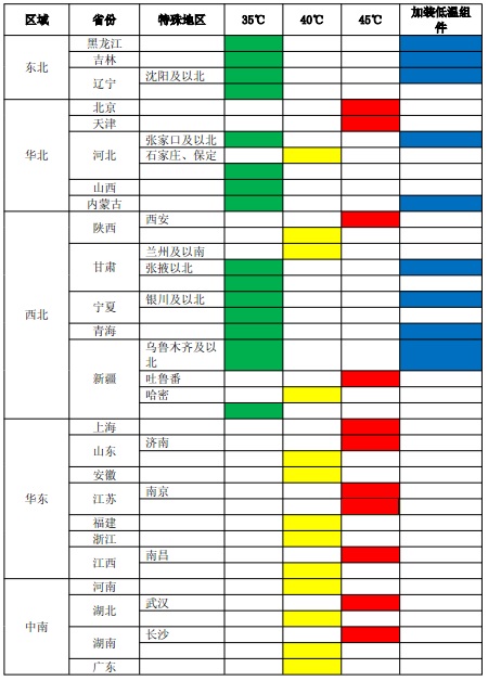 另外,冬季室外溫度低于-15℃的地區,除了按照標準配置冷凝器外,還要加裝低溫組件,才能保證壓縮機在較低的溫度下能夠正常工作。需要注意的是:一個壓縮機對應一套低溫組件,例如,雙壓縮機系統需要配置兩套低溫組件。在我國機房空調需要配置低溫組件的地區主要有:黑龍江、吉林、遼寧(沈陽及以北)、內蒙、青海、寧夏(銀川及以北)、新疆(烏魯木齊及以北)、甘肅(蘭州以北)。全國參考環境溫度及建議配置見下表: