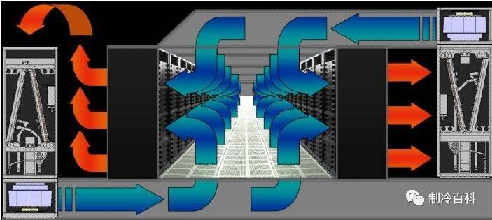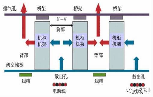 在這樣的布局中,冷風(fēng)首先送入地板下的靜壓箱,通過出風(fēng)地板進(jìn)入服務(wù)器機(jī)柜進(jìn)行冷卻IT設(shè)備,從機(jī)柜中排出的熱風(fēng),進(jìn)入機(jī)房空間,經(jīng)由機(jī)房空間自然回風(fēng)至空調(diào),或經(jīng)過天花板空間回風(fēng)至空調(diào)進(jìn)行制冷。