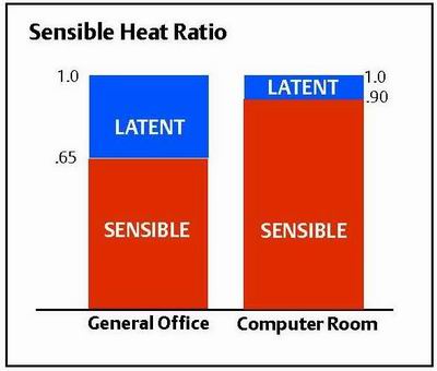 圖1 普通辦公環境中,60%-70% 為顯熱負載(.6-.7 SHR ),而計算機機房有90%-100% 的顯熱負載(.85-1.0 SHR )。