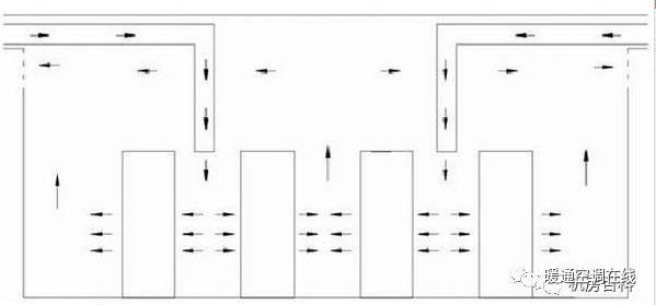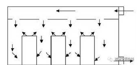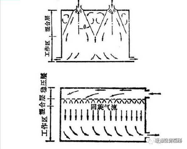 上送下回氣流組織是通常采用的全室空調(diào)送回風(fēng)的基本方式。上送還可分為機(jī)房頂送或緊靠機(jī)房頂下的上部側(cè)送兩種形式。下回通常采用為機(jī)房的下部側(cè)回形式。