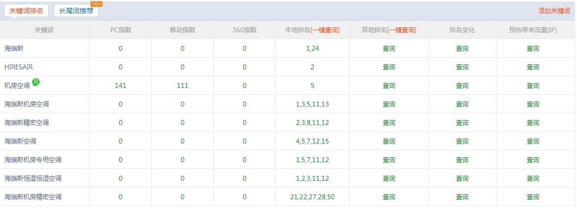 海瑞思網站一直以來排名都很不錯,核心關鍵詞“機房空調”“精密空調”“機房精密空調”“機房專用空調”都在百度的首頁,最不好的時候也是在百度的第二頁。品牌詞更不用說一直都是百度第一位。其他關鍵詞也有幾個,每天從搜索引擎來的IP也有20個左右。