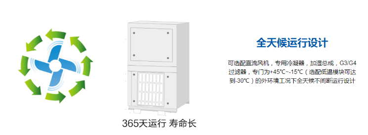 可選配支流風機,專用冷凝器,加濕總成,G3/G4過濾器,專門為+45℃~-15℃(選配低溫模塊可達到-30℃)的外環境工況下全天候不間斷運行設計。