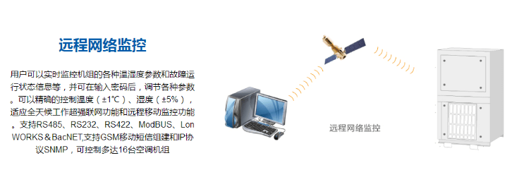 用戶可以實時監控機組的各種溫濕度參數和故障運行狀態信息等,并可在輸入密碼后調節各種參數。可以精確的控制溫度(±1℃)、濕度(±5%),適合全天候工作。強大聯網功能和遠程移動監控功能。支持RS485、RS232、RS422、ModBUS、LonWORKS&BacNET,支持GSM移動短信組建和IP協議SNMP,可控制多達16臺空調機組。